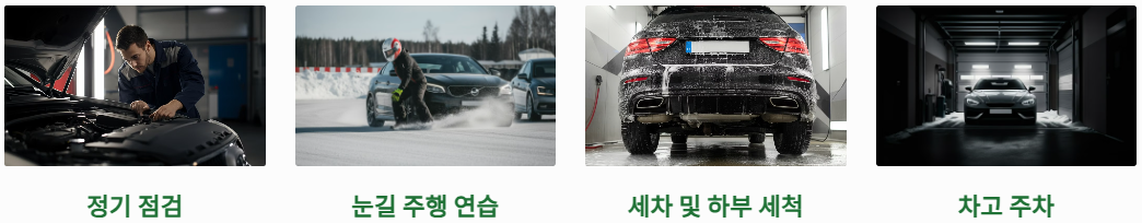 - 세차 및 하부 세척: 도로의 염화칼슘이 차량 부식을 유발할 수 있으므로, 세차 후 하부를 깨끗이 세척하세요.