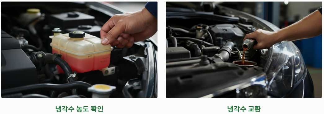 - 냉각수 농도 확인: 부동액의 농도가 낮으면 냉각수가 얼어 엔진이 손상될 수 있습니다.