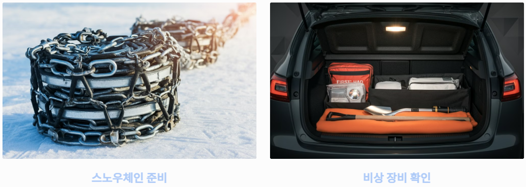 - 비상 장비 확인: 차량 안에 구급상자, 방한용 담요, 손전등, 휴대용 삽, 긴급 탈출 도구 등을 준비하세요.