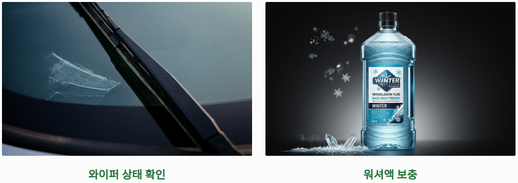- 워셔액 보충: 겨울용 워셔액(저온에서도 얼지 않는 제품)을 사용하세요.