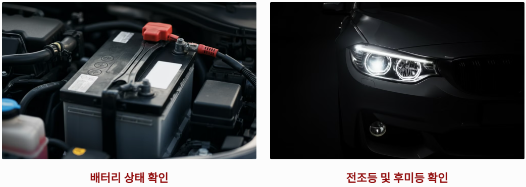 - 배터리 상태 확인: 겨울에는 배터리 성능이 저하되기 쉽습니다. 충전 상태와 단자 부식을 점검하세요.