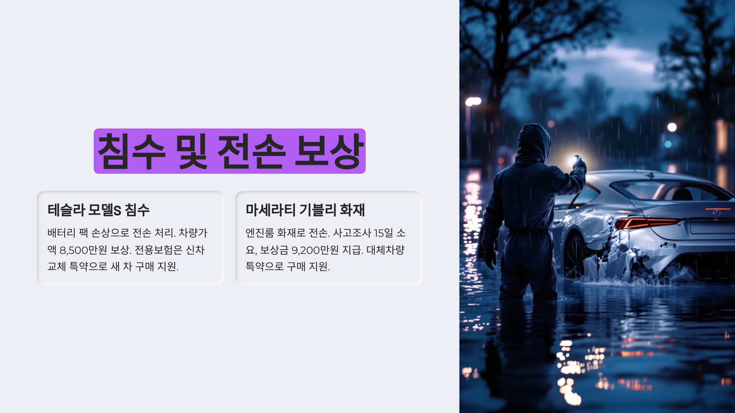 테슬라 모델S 침수: 배터리 팩 손상으로 전손 처리. 차량가액 8,500만원 보상. 전용보험은 신차교체 특약으로 새 차 구매 지원.