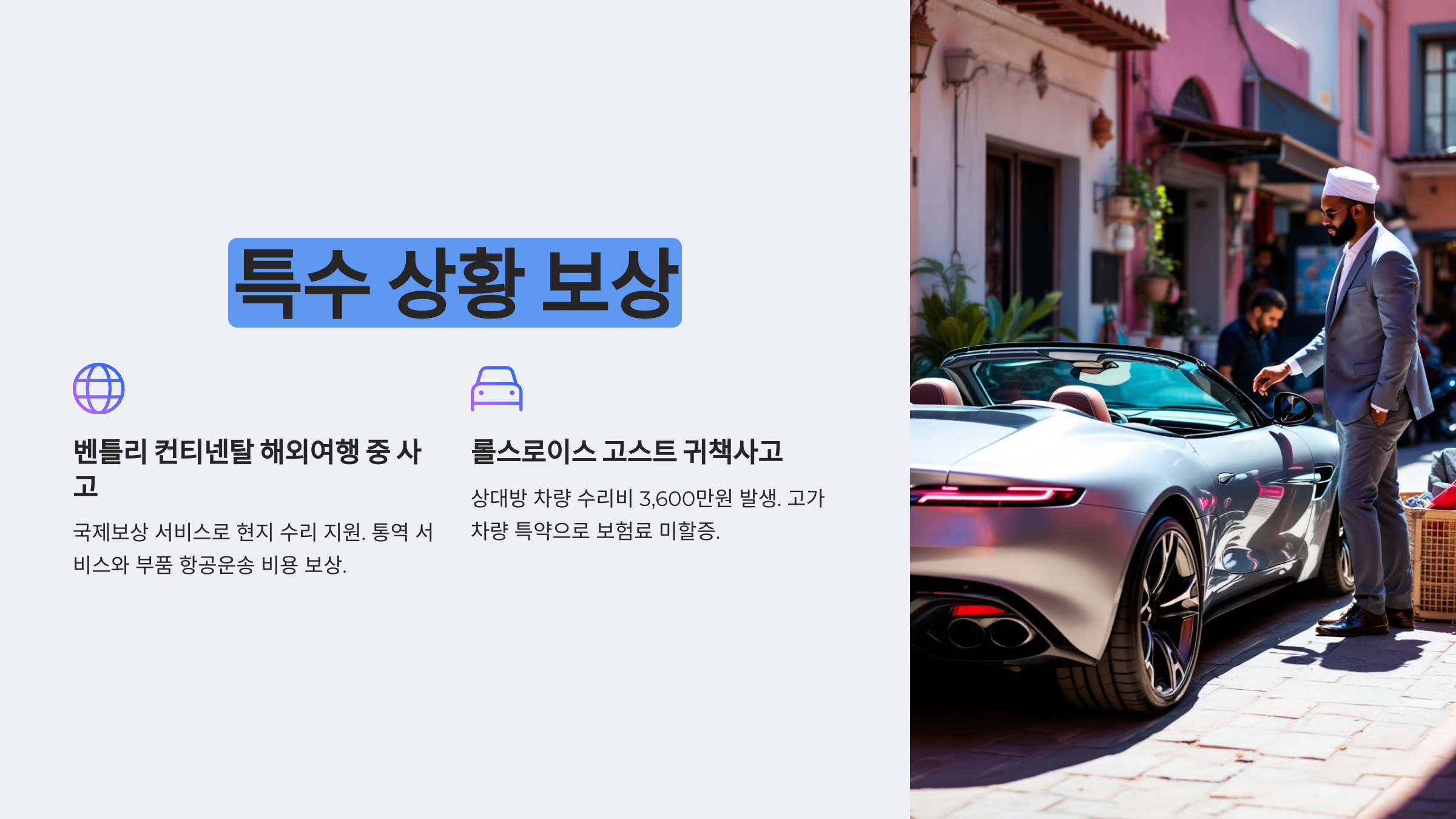 벤틀리 컨티넨탈 해외여행 중 사고: 국제보상 서비스로 현지 수리 지원. 통역 서비스와 부품 항공운송 비용 보상.