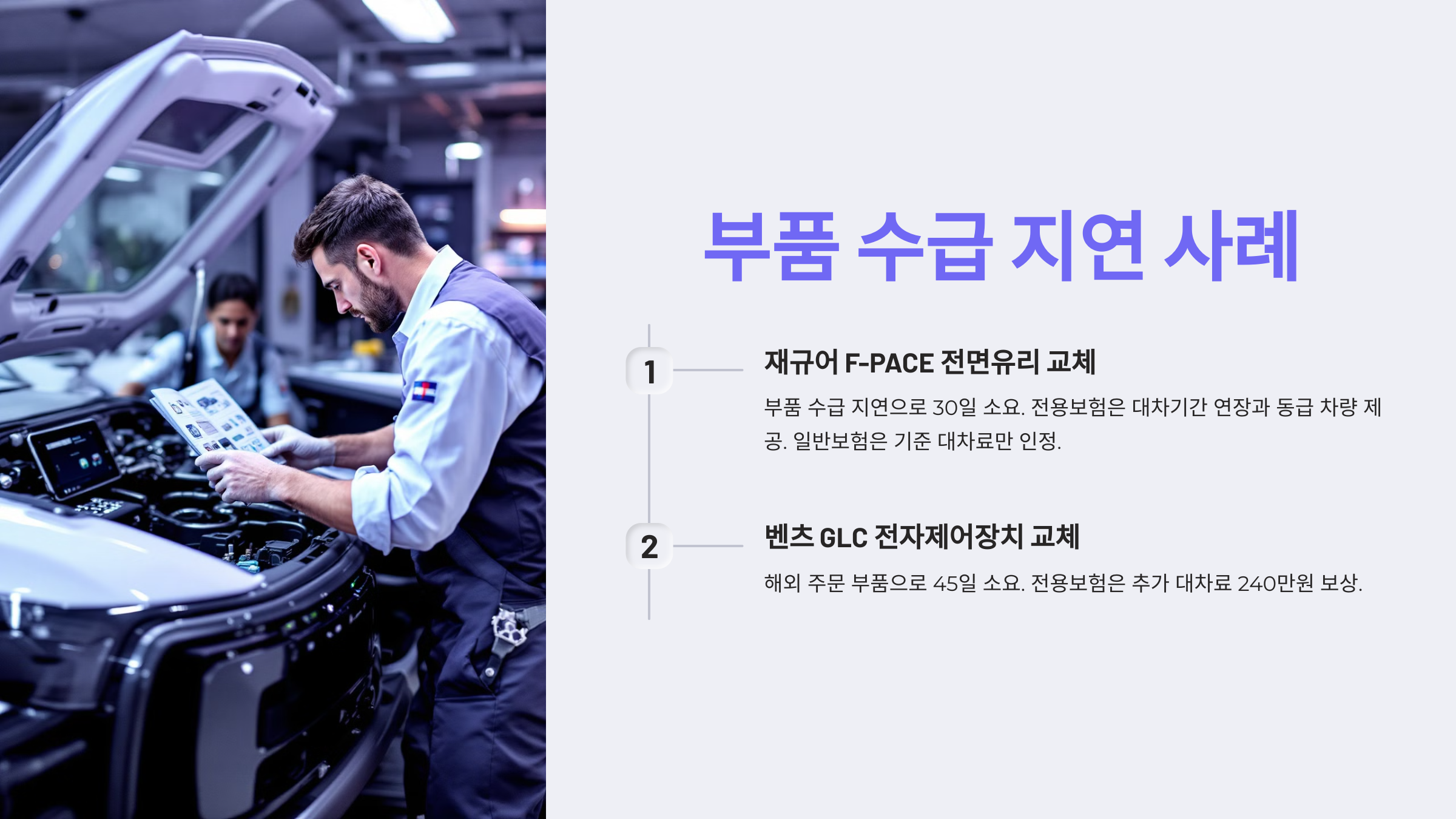 벤츠 GLC 전자제어장치 교체: 해외 주문 부품으로 45일 소요. 전용보험은 추가 대차료 240만원 보상.