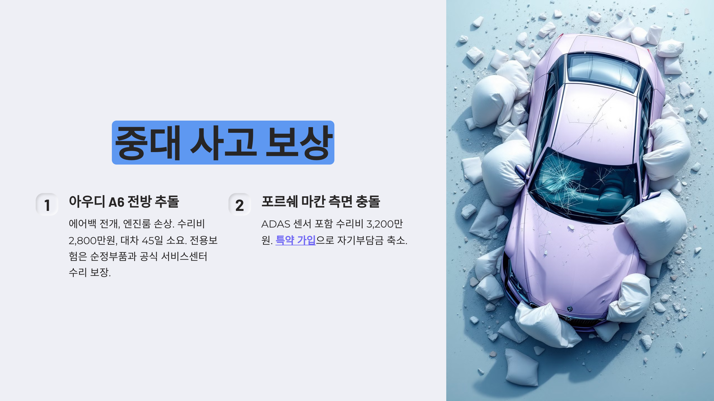 포르쉐 마칸 측면 충돌: ADAS 센서 포함 수리비 3,200만원. 특약 가입으로 자기부담금 축소.