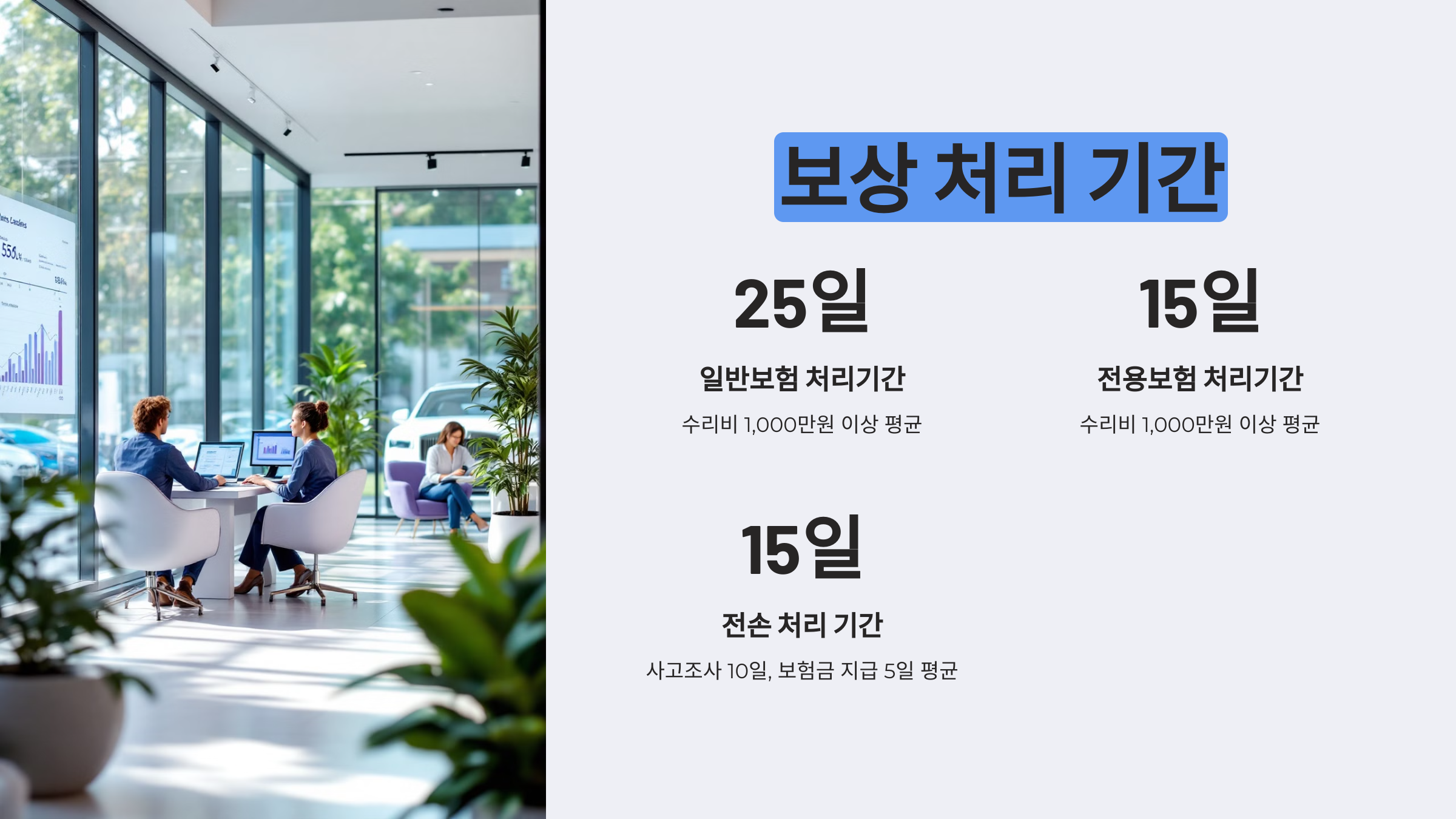 수리비 1,000만원 이상: 평균 처리기간 일반보험 25일, 전용보험 15일. 부품 수급이 보상 지연의 주요 원인.