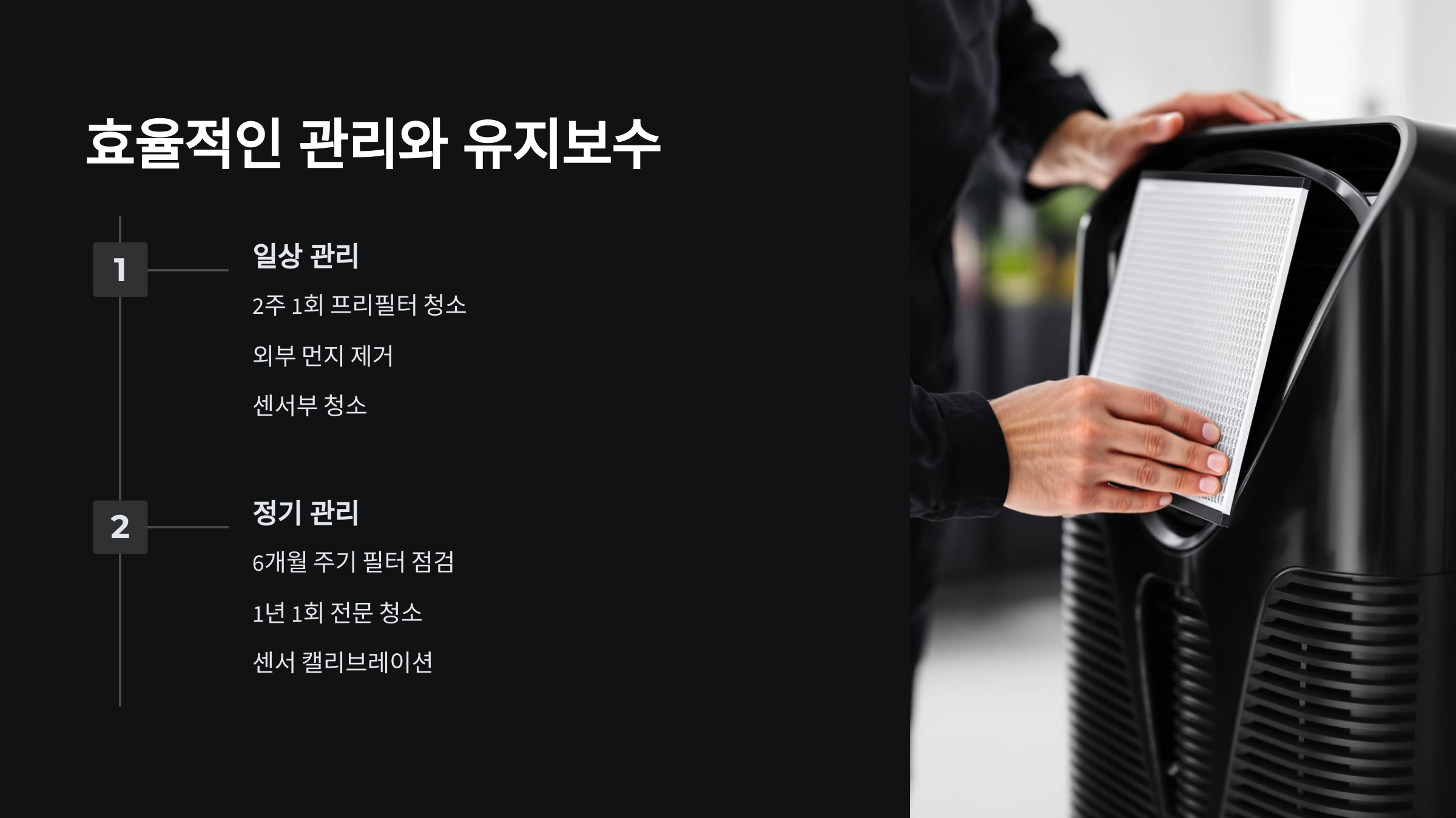공기청정기의 성능을 최적으로 유지하기 위해서는 적절한 관리가 필수적입니다. 정기적인 필터 교체와 청소는 기본이며, 설치 위치와 사용 환경에 따른 맞춤형 관리가 필요합니다.
