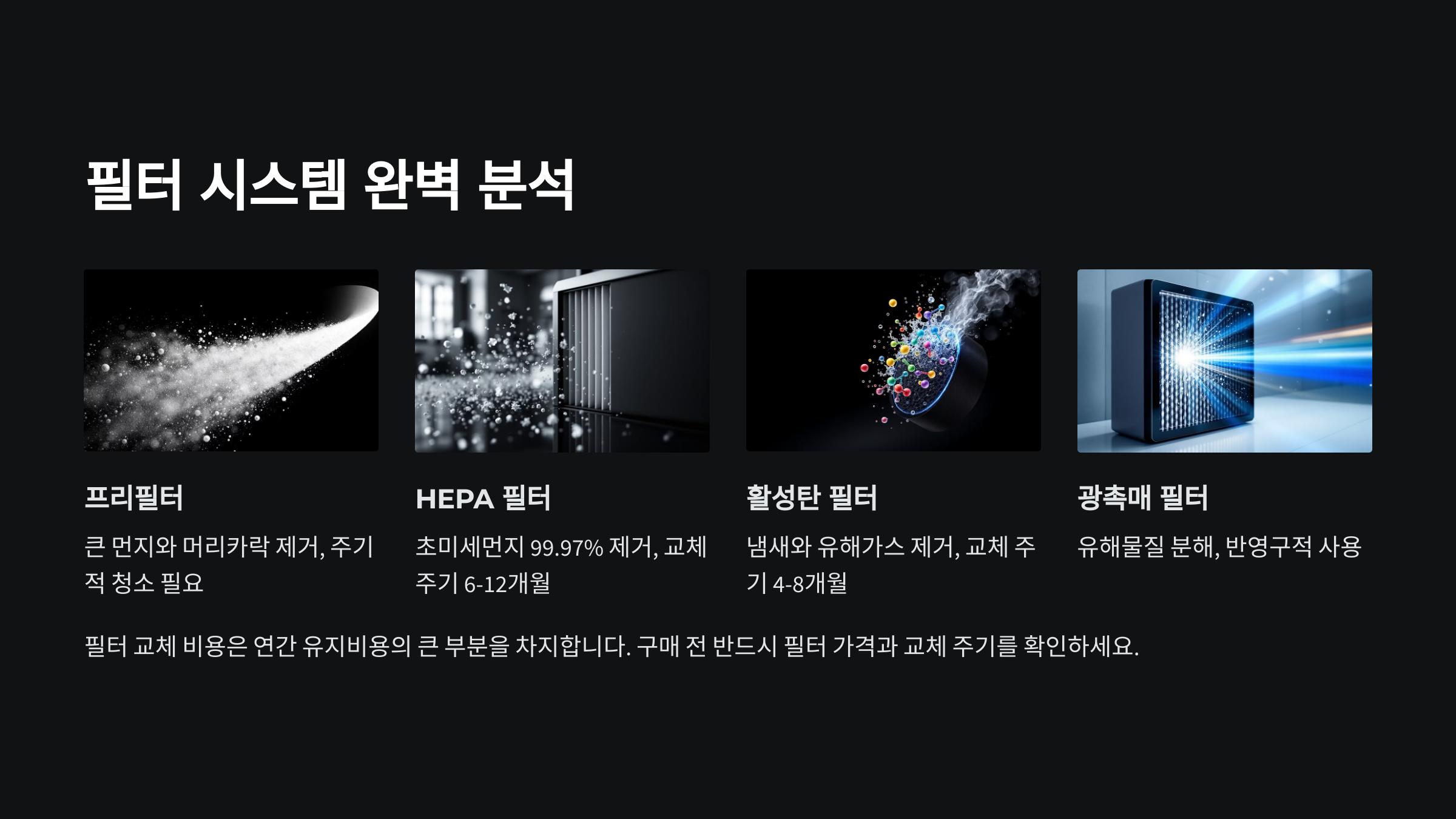 필터 교체 비용은 연간 유지비용의 큰 부분을 차지합니다. 구매 전 반드시 필터 가격과 교체 주기를 확인하세요.