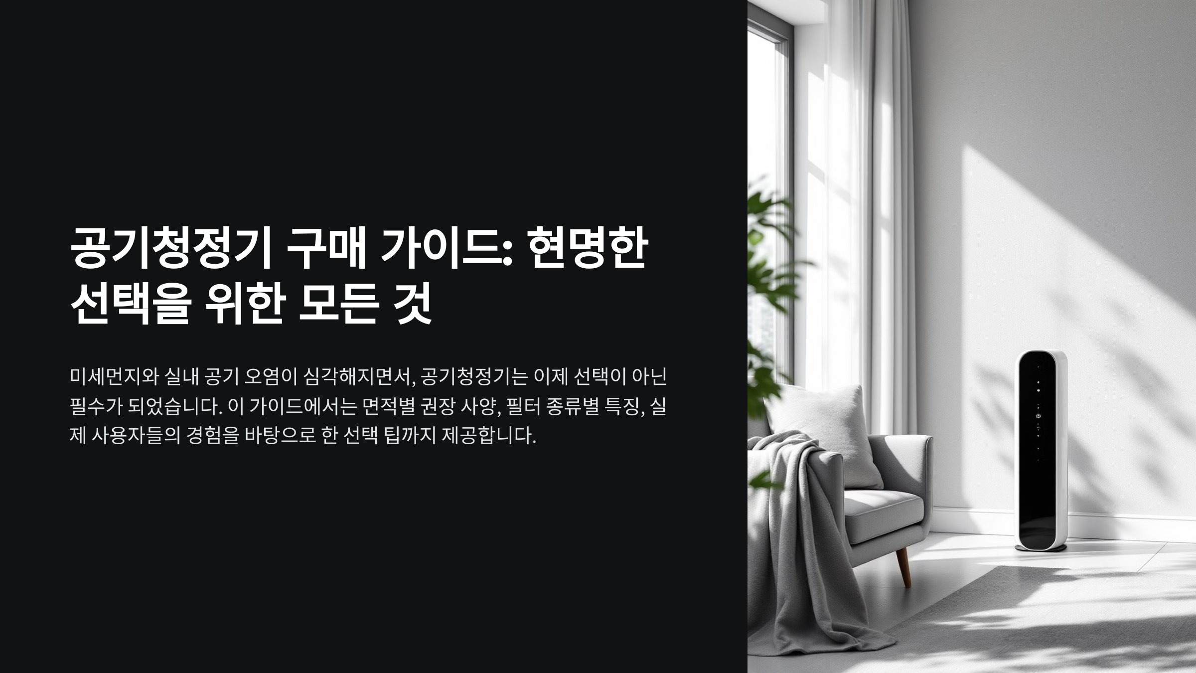미세먼지와 실내 공기 오염이 심각해지면서, 공기청정기는 이제 선택이 아닌 필수가 되었습니다. 하지만 수많은 제품과 복잡한 성능 지표들 사이에서 최적의 선택을 하기란 쉽지 않습니다. 이 가이드에서는 면적별 권장 사양부터 필터 종류별 특징, 그리고 실제 사용자들의 경험을 바탕으로 한 선택 팁까지, 현명한 구매를 위한 모든 정보를 제공합니다.