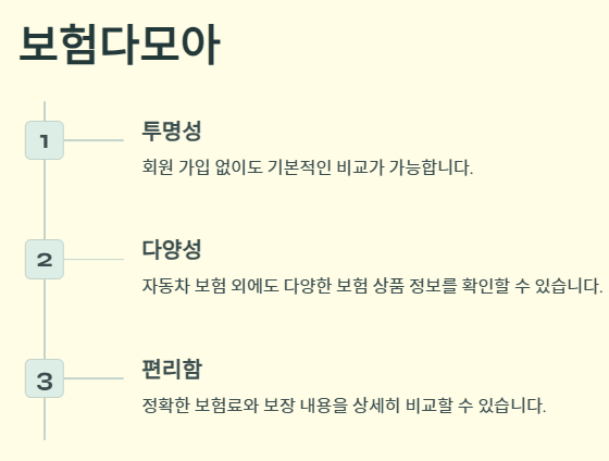 - 시간 절약: 각 보험사를 개별적으로 조사할 필요 없이, 한곳에서 모든 정보를 확인할 수 있습니다.