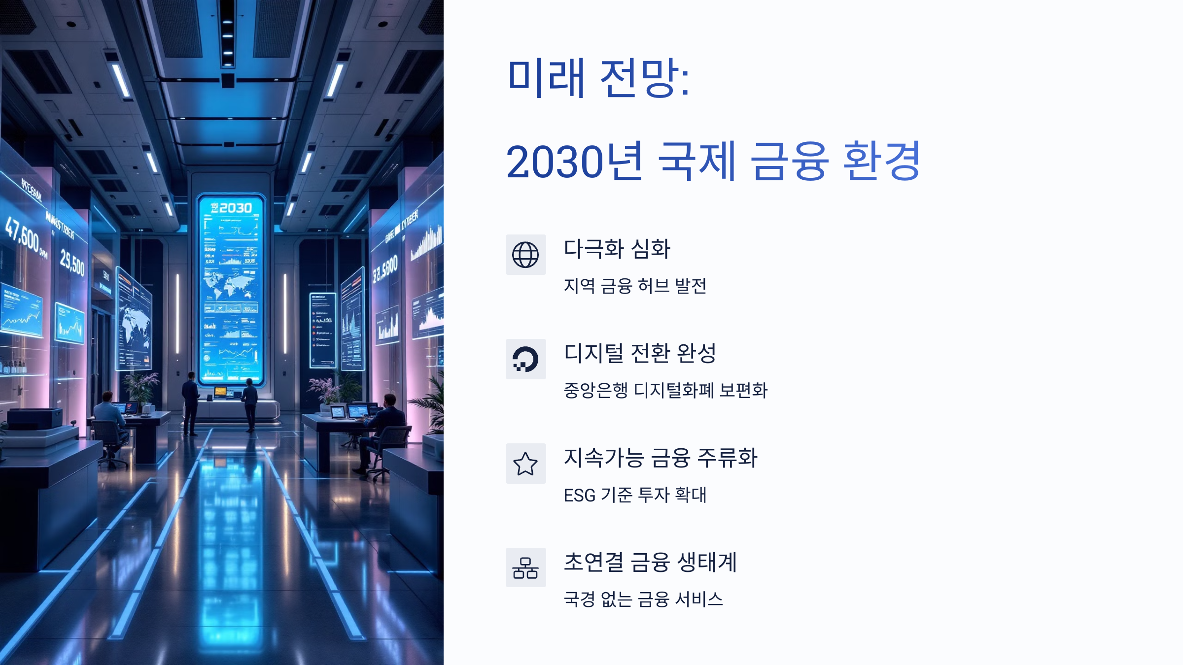 기술 혁신과 정치적 타협을 통해 새로운 형태의 통합된 금융 시스템이 등장합니다. 분산화된 금융 기술(DeFi)과 중앙은행 디지털 화폐(CBDC)가 결합된 하이브리드 시스템이 국경을 초월한 결제와 자산 거래를 용이하게 합니다. 국가 간 협약을 통해 디지털 ID, 금융 감독, 세금 처리를 위한 새로운 국제 표준이 마련됩니다.
