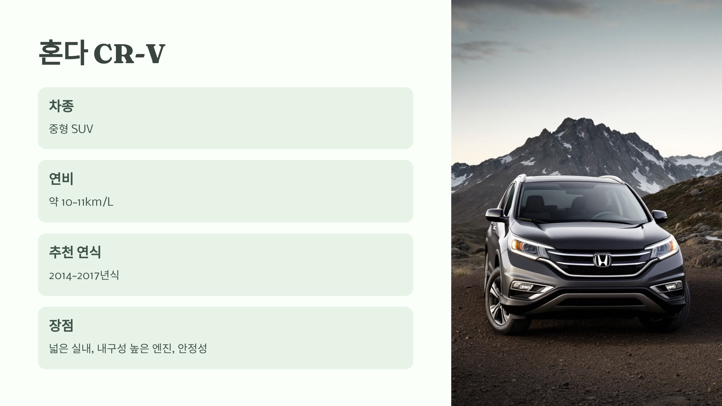 혼다 CR-V는 중형 SUV 중에서 내구성과 안정성이 뛰어난 모델로, SUV 특유의 공간성과 편의성을 갖추면서도 유지비가 낮아 경제적입니다. 특히 중고차로 구매 시에도 유지비가 적게 들고, 엔진과 전반적인 차량 내구성이 높아 장기 소유에 적합합니다.