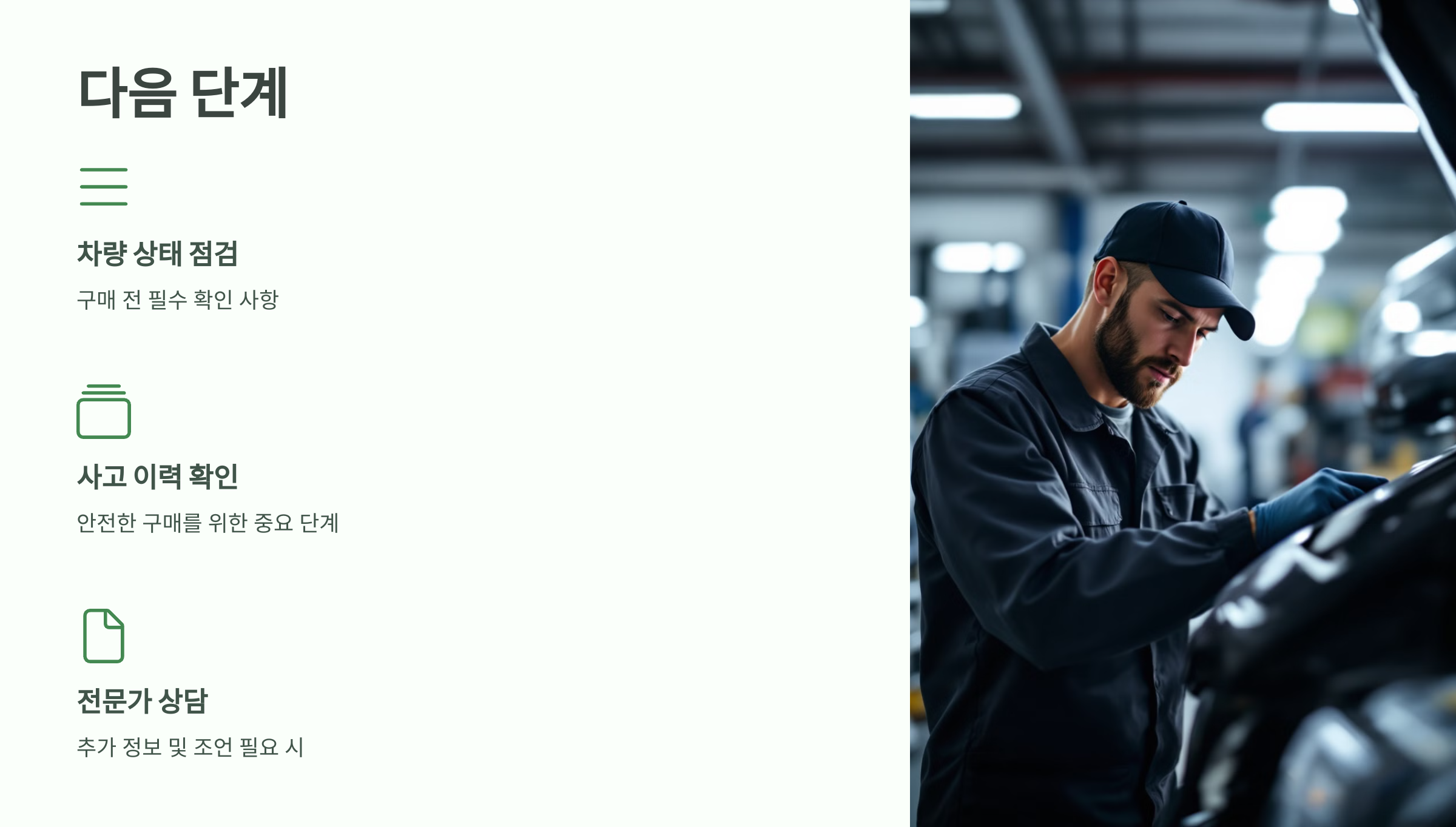 다음 단계: 중고차 구매 전 차량 상태 점검과 사고 이력 확인은 필수입니다. 중고차 상담이나 추가 정보가 필요하시다면 아래 링크를 통해 전문가와 상담하실 수 있습니다.