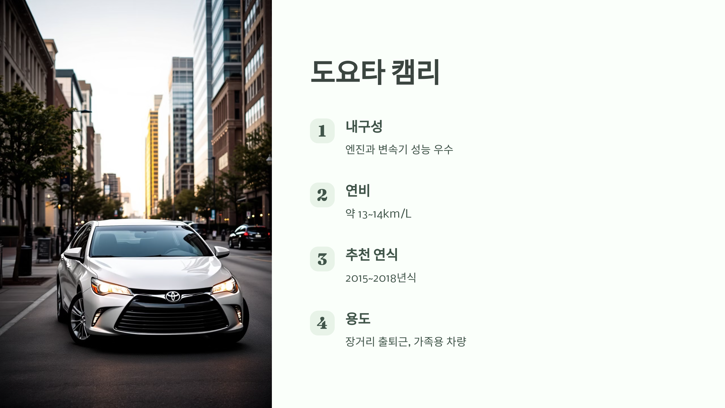 도요타 캠리는 내구성이 뛰어나고 잔고장이 적은 모델로 유명합니다. 특히 엔진과 변속기 성능이 우수하여 장기 소유 시에도 유지비가 적게 드는 모델로, 국내에서도 중고차 시장에서 높은 평가를 받고 있습니다.