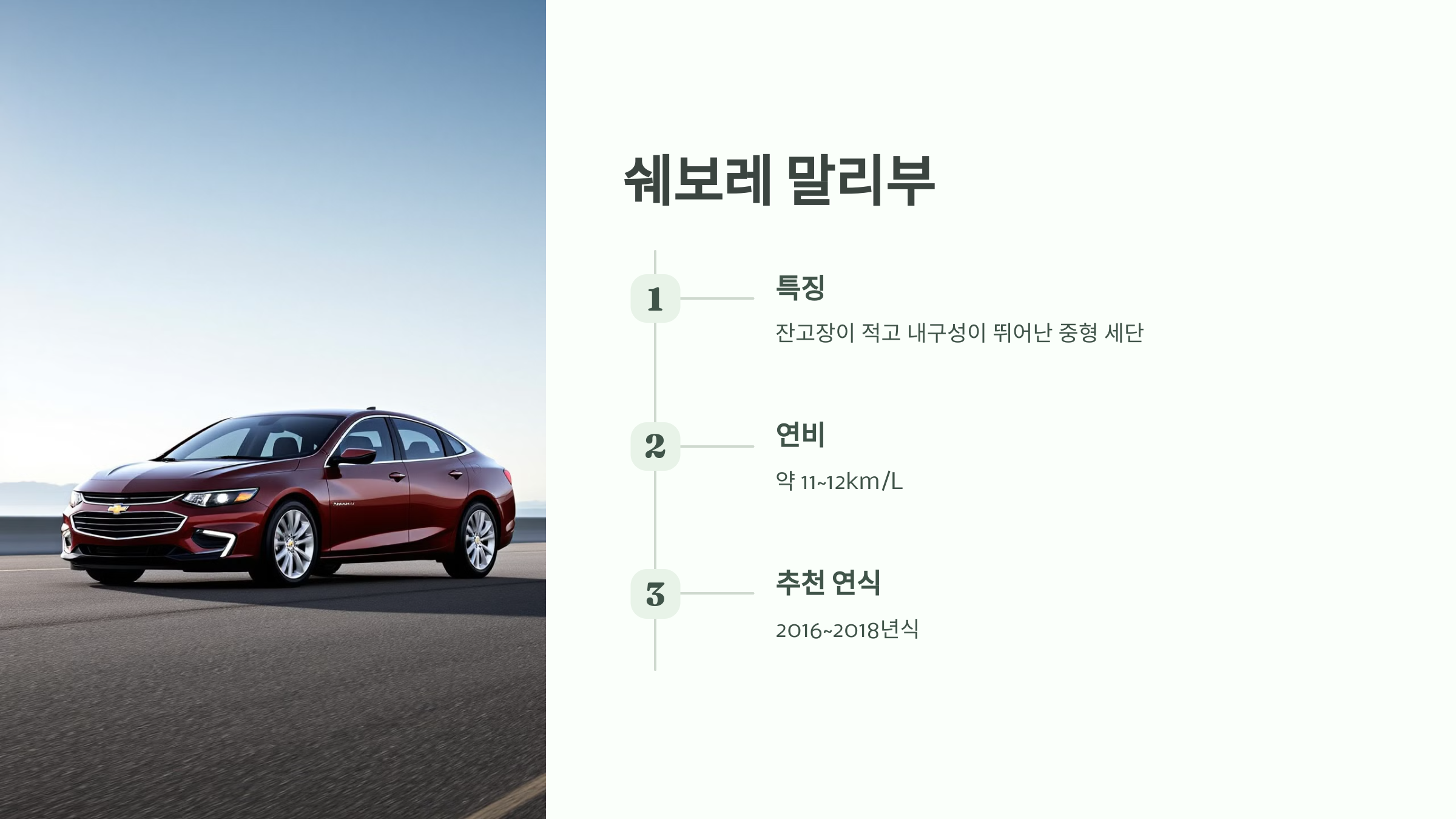 쉐보레 말리부는 중형 세단 중에서도 잔고장이 적고 내구성이 뛰어난 모델로, 중고차 시장에서도 인기가 높습니다. 특히 연비가 좋고 고속 주행 시 안정성이 우수하여, 장거리 주행이나 출퇴근용으로 적합합니다.