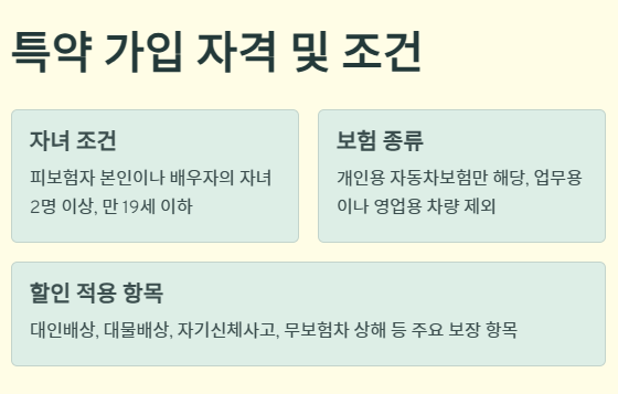 보험계약자는 개인용 자동차보험에 가입한 상태여야 하며, 업무용이나 영업용 차량은 할인 대상에서 제외됩니다. 보험료 할인은 대인배상, 대물배상, 자기신체사고, 무보험차 상해 등 주요 보장 항목에 적용되며, 일부 특약은 할인 제외 항목으로 분류될 수 있습니다. 계약자는 연간 보험료 갱신 시마다 자격 유지 여부를 증명해야 할 수 있습니다.