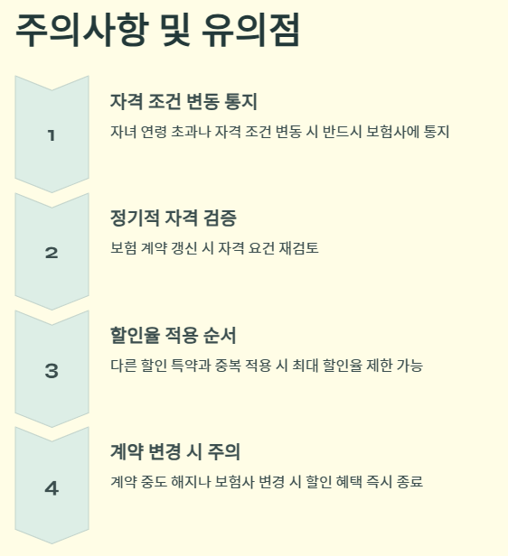 다른 할인 특약과의 중복 적용 시에는 할인율 적용 순서나 최대 할인율 제한이 있을 수 있습니다. 보험사마다 정책이 다르므로, 계약 전 상세한 확인이 필요합니다. 또한, 계약 중도 해지나 보험사 변경 시에는 할인 혜택이 즉시 종료될 수 있으며, 새로운 계약에서는 다시 자격 심사를 받아야 합니다.