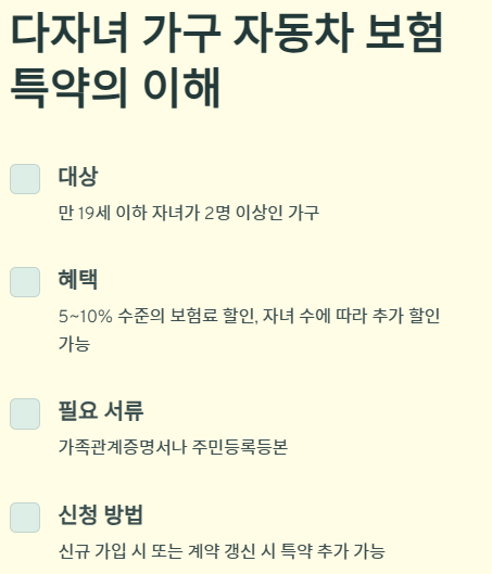 다자녀 가구의 경제적 부담을 덜어주는 자동차 보험료 특약에 대해 상세히 알아보겠습니다. 보험사들이 제공하는 다자녀 가구 특별 할인은 가정 경제에 실질적인 도움이 되는 중요한 혜택입니다. 이 가이드를 통해 특약의 세부 내용부터 신청 방법, 주의사항까지 꼼꼼히 살펴보며, 자동차 보험료 절감을 위한 실질적인 방법을 제시해드립니다.
