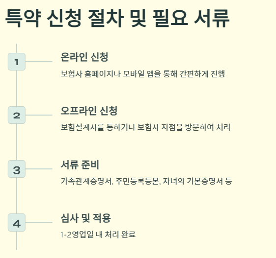 특약 가입을 위해서는 가족관계증명서나 주민등록등본 같은 기본 서류가 필요합니다. 자녀 수 증명이 가능한 공식 서류를 통해 할인 자격을 검증받게 됩니다. 보험료 할인은 신규 가입시점부터 적용되며, 기존 계약자의 경우 계약 갱신 시점에 특약을 추가할 수 있습니다. 대부분의 보험사에서는 온라인 신청 시스템을 구축하여 간편한 신청 절차를 제공하고 있습니다.