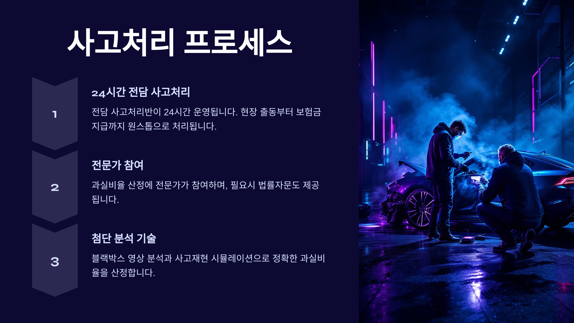 전담 사고처리반이 24시간 운영됩니다. 현장 출동부터 보험금 지급까지 원스톱으로 처리됩니다. 과실비율 산정에 전문가가 참여하며, 필요시 법률자문도 제공됩니다.