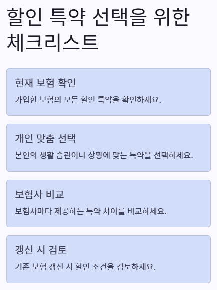 보험 가입 시 담당자와 충분히 상담하여 가능한 모든 할인 특약을 확인해야 합니다. 특히, 특약 조건은 보험사마다 다르기 때문에 계약 전 꼼꼼히 확인해야 합니다.