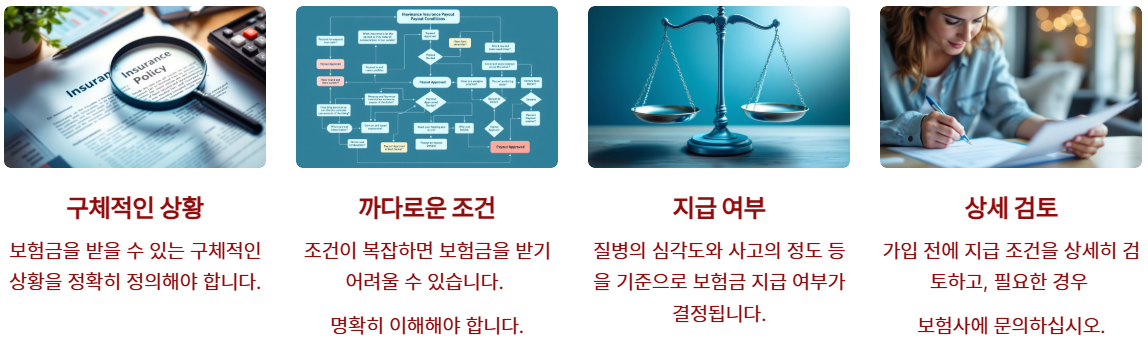 - 질병의 심각도, 사고의 정도 등을 기준으로 지급 여부가 결정됩니다.