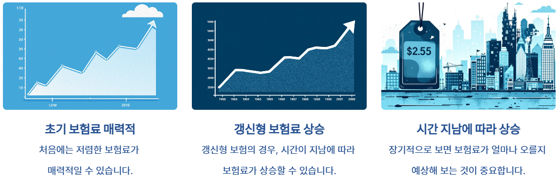 가입 초기에는 저렴한 보험료가 매력적으로 느껴질 수 있습니다. 하지만 갱신형 보험은 시간이 지남에 따라 보험료가 상승할 수 있습니다.