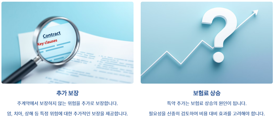 특약은 주계약에서 보장하지 않는 추가적인 위험을 보장하는 역할을 합니다. 그러나 가입 시 특약을 추가하지 않으면 보장받을 수 없는 항목들이 생길 수 있습니다.