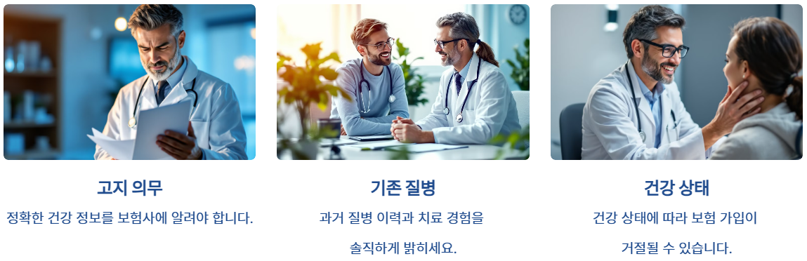 보험 가입 시 건강 상태를 사실대로 고지해야 합니다. 고지 의무를 위반하면 나중에 보험금 지급이 거절될 수 있습니다.