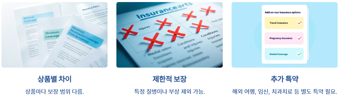 - 보장 범위는 상품마다 다르며, 특정 질병이나 부상은 포함되지 않을 수 있습니다.