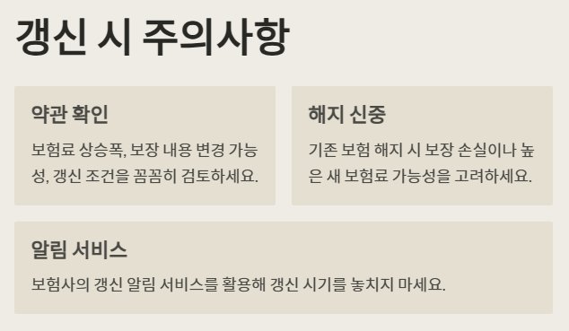 갱신 시 기존 보험을 해지하고 새로운 보험으로 갈아타려는 유혹을 받을 수 있습니다. 하지만, 해지 시 기존 보장을 잃거나 새로운 보험료가 더 비쌀 가능성이 있으므로 신중한 판단이 필요합니다.