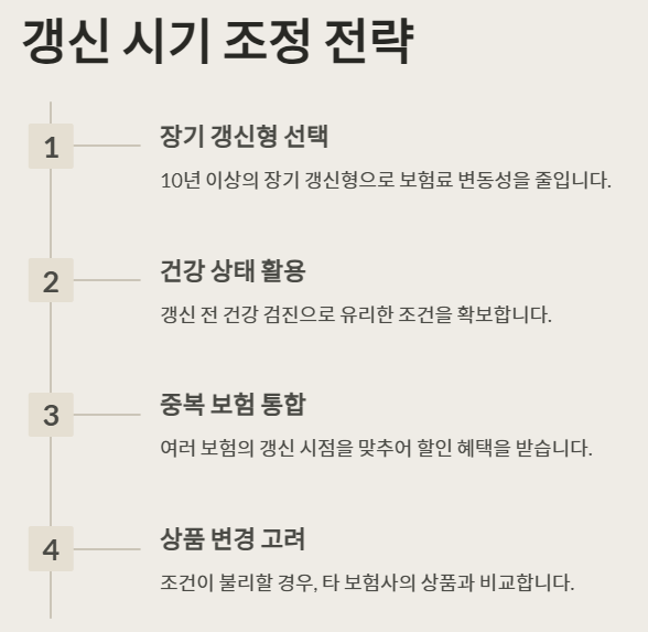 보험 갱신 시점에 건강 상태가 악화되면 보험료가 급격히 오를 수 있습니다. 갱신 전에 정기적인 건강 검진을 받고, 건강한 상태를 유지하여 보험사로부터 유리한 조건을 제시받는 것이 중요합니다.