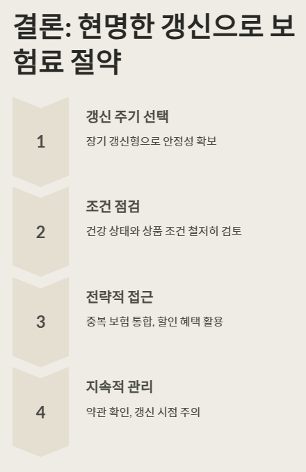 보험 갱신 시기를 조정하여 보험료를 아끼는 것은 재정적 안정성을 높이는 데 매우 효과적인 방법입니다. 갱신 주기를 신중히 선택하고, 건강 상태와 상품 조건을 철저히 점검하며, 중복 보험을 통합하는 등의 전략을 적극적으로 활용하세요. 또한, 약관을 면밀히 검토하고 갱신 시점을 놓치지 않는 것도 중요합니다. 이 모든 과정을 통해 보험료를 절약할 수 있을 뿐만 아니라, 자신에게 꼭 맞는 보장 조건을 유지할 수 있습니다.