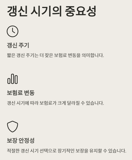 보험 갱신 시기는 보험료에 직접적인 영향을 미칩니다. 보험사들은 보통 나이와 건강 상태를 기준으로 갱신 시의 보험료를 산정하며, 이는 갱신 주기가 짧을수록 더 자주 변경될 수 있습니다. 갱신 주기가 짧으면, 같은 보장을 유지하기 위해 더 많은 보험료를 납부해야 할 가능성이 커집니다.