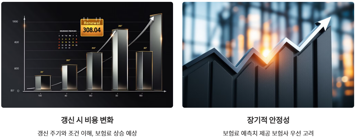 보험료 예측치를 제공하는 보험사를 우선 고려하고, 장기적으로 경제적인 혜택이 있는 계약인지 검토하세요. 갱신 주기가 짧을수록 비용 변화에 대한 대비가 필요합니다.