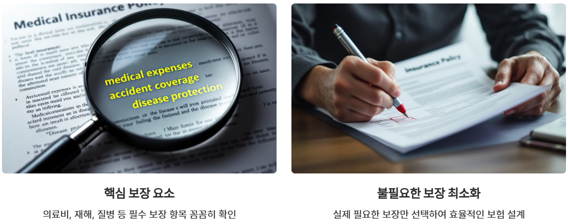 필요 없는 보장이 포함되어 있다면 보험료가 비싸질 수 있습니다. 자신에게 실제로 필요한 보장이 무엇인지 파악한 후, 불필요한 보장은 제외하여 효율적인 보험을 설계하세요.