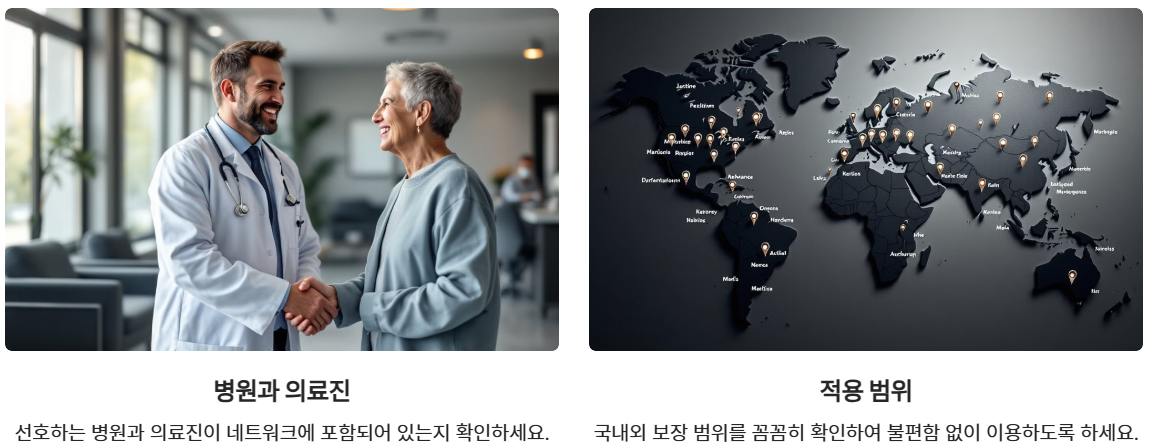 보험이 적용되는 의료 네트워크를 확인하고, 자신이 선호하는 병원과 의료진이 포함되어 있는지 검토하세요. 특히 응급 상황 시 이용 가능한 병원이나 해외에서도 사용 가능한지 여부를 점검해야 합니다.