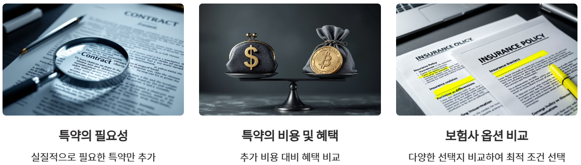 특약이 추가되는 경우, 추가 비용 대비 혜택이 충분한지 검토하세요. 실제로 자주 사용하거나, 큰 금전적 부담을 덜어줄 수 있는 특약을 우선적으로 고려하세요.