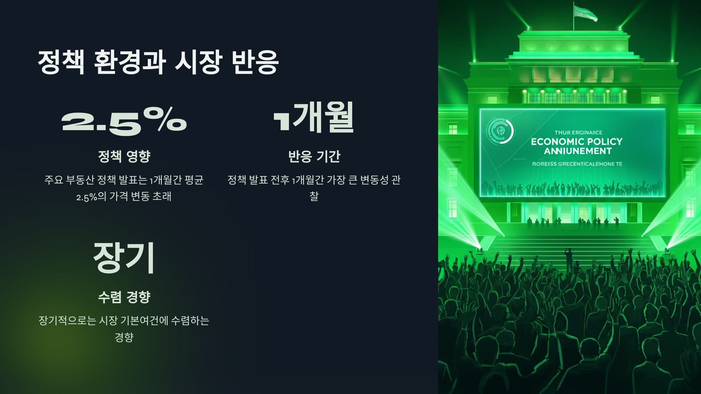 A: 주요 부동산 정책 발표는 발표 전후 1개월간 평균 2.5%의 가격 변동을 초래하며, 금융규제나 세제 변화는 더 큰 영향을 미칠 수 있습니다. 다만 장기적으로는 시장 기본여건에 따라 수렴하는 경향을 보입니다.