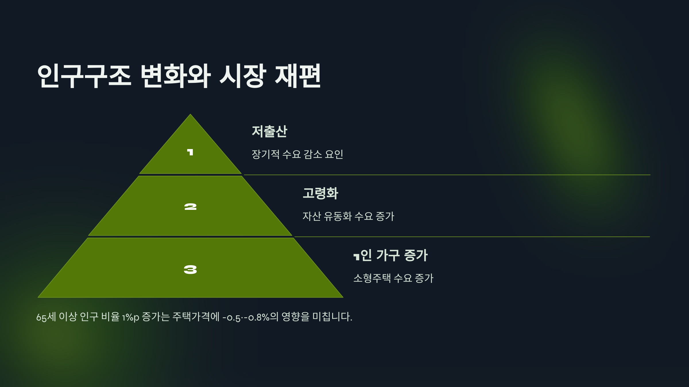 A: 65세 이상 인구 비율 1%p 증가는 평균 -0.5~-0.8%의 가격 하락 효과가 있으며, 주택 유형별 수요 변화, 자산 유동화 수요 증가 등의 구조적 변화를 초래합니다.