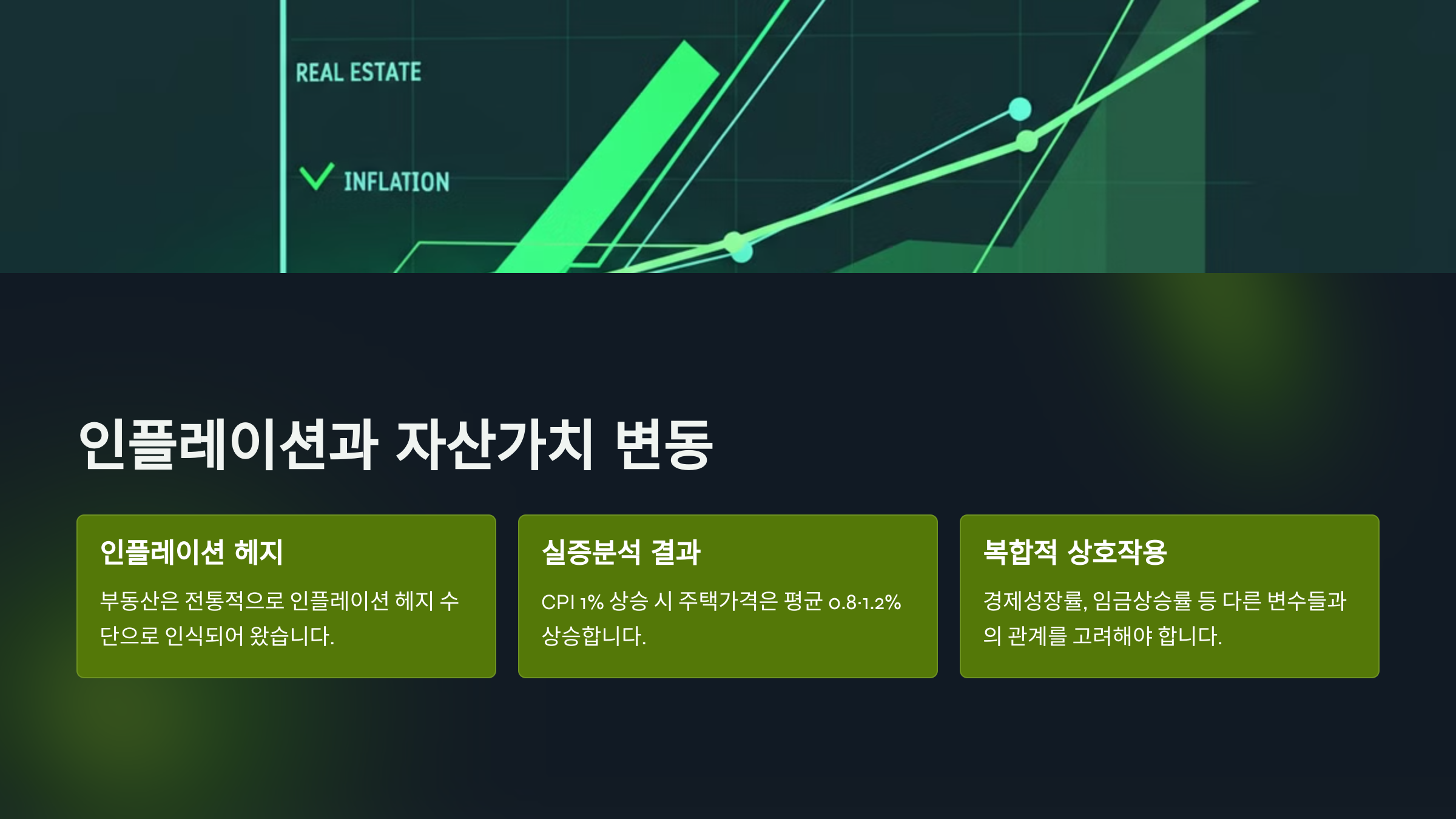 A: 전통적으로 부동산은 인플레이션 헤지 수단으로 인식되어 왔으며, CPI 1% 상승 시 평균 0.8~1.2%의 가격 상승 효과가 있습니다. 그러나 최근에는 이러한 관계가 약화되는 경향도 보입니다.