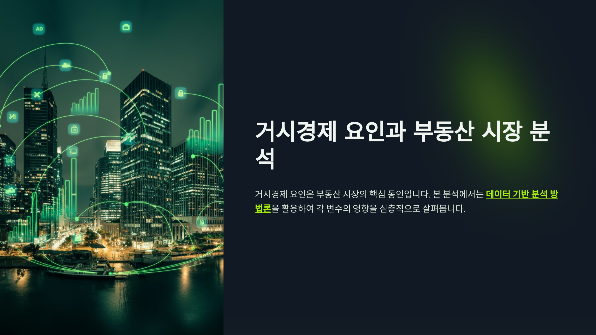거시경제 요인은 부동산 시장의 움직임을 결정하는 핵심 동인입니다. 본 분석에서는 데이터 기반 분석 방법론을 활용하여 각 거시경제 변수가 부동산 시장에 미치는 영향을 심층적으로 살펴보고, 그 상호작용을 체계적으로 분석합니다.