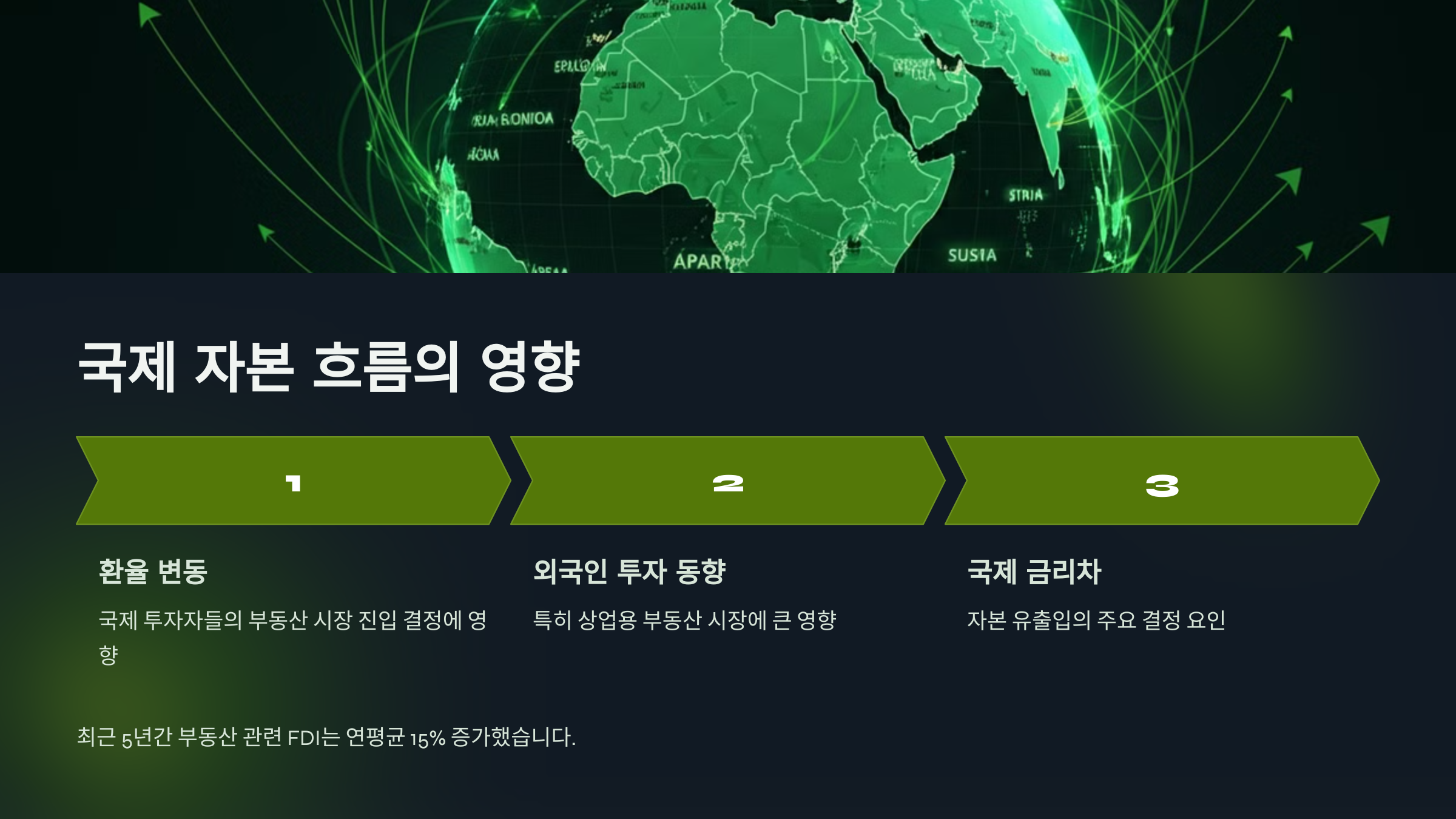 글로벌화에 따라 국제 자본의 유출입이 부동산 시장에 미치는 영향이 커지고 있습니다. 환율 변동, 외국인 투자 동향, 국제 금리차 등이 주요 변수로 작용합니다. 특히 글로벌 금융위기 이후 국가 간 자본 이동의 상관관계가 높아졌습니다. 이는 국내 부동산 시장의 변동성을 증가시키는 요인이 됩니다.