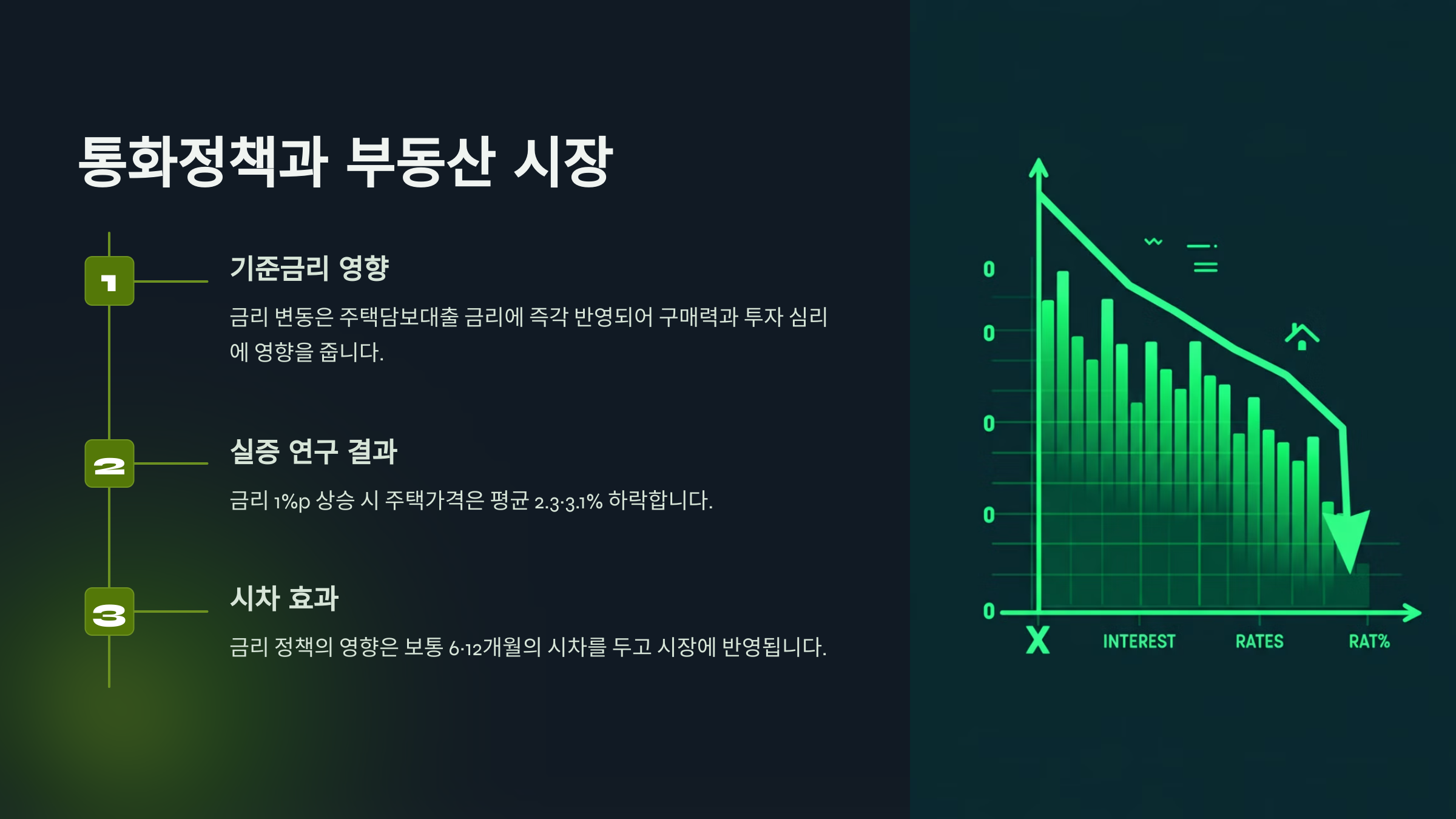 최근의 실증 연구에 따르면, 금리 1%p 상승 시 주택가격은 평균 2.3~3.1% 하락하는 것으로 나타났습니다. 다만 이러한 영향은 지역과 주택 유형에 따라 상이하게 나타나며, 지역별 특성에 따라 그 민감도가 다르게 나타납니다. 금리 정책의 영향은 보통 6~12개월의 시차를 두고 시장에 반영됩니다.