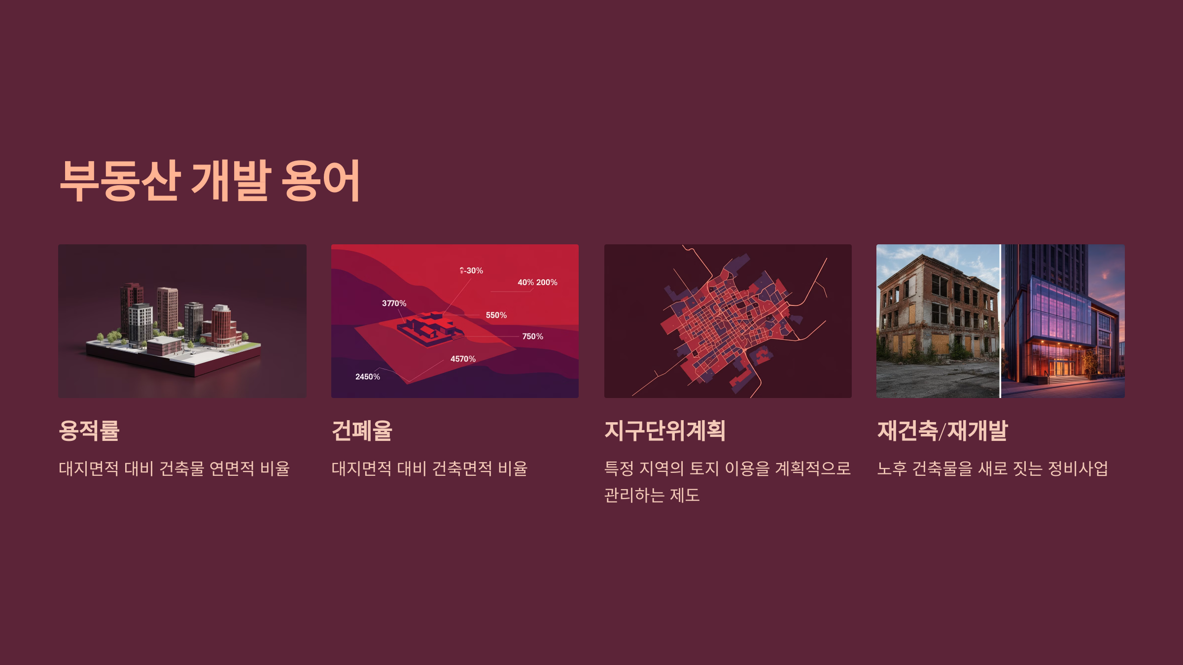 용적률은 대지면적 대비 건축물 연면적의 비율을, 건폐율은 대지면적 대비 건축면적의 비율을 의미합니다. 이는 지역별 개발 사례에서 중요한 지표가 됩니다. 지구단위계획은 특정 지역의 토지 이용을 계획적으로 관리하는 제도이며, 재건축/재개발은 노후 건축물을 새로 짓는 정비사업을 말합니다.