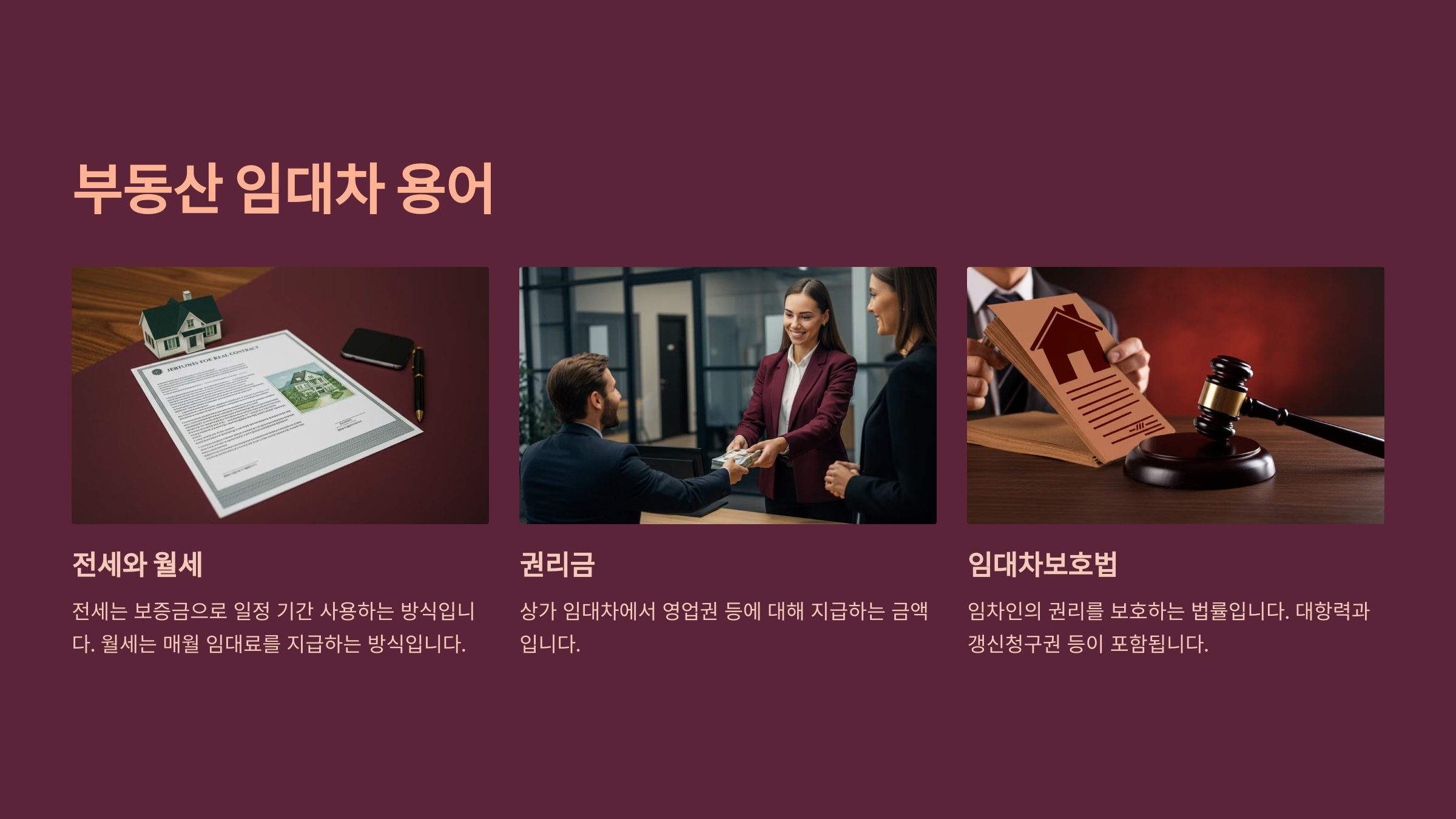 전세는 일정 금액(보증금)을 맡기고 일정 기간 사용하는 임대차 방식이며, 월세는 매월 임대료를 지급하는 방식입니다. 반전세는 전세와 월세를 혼합한 형태입니다. 권리금은 상가 임대차에서 영업권 등에 대해 지급하는 금액을 의미하며, 이에 대한 이해는 시장 초보자들에게 특히 중요합니다.