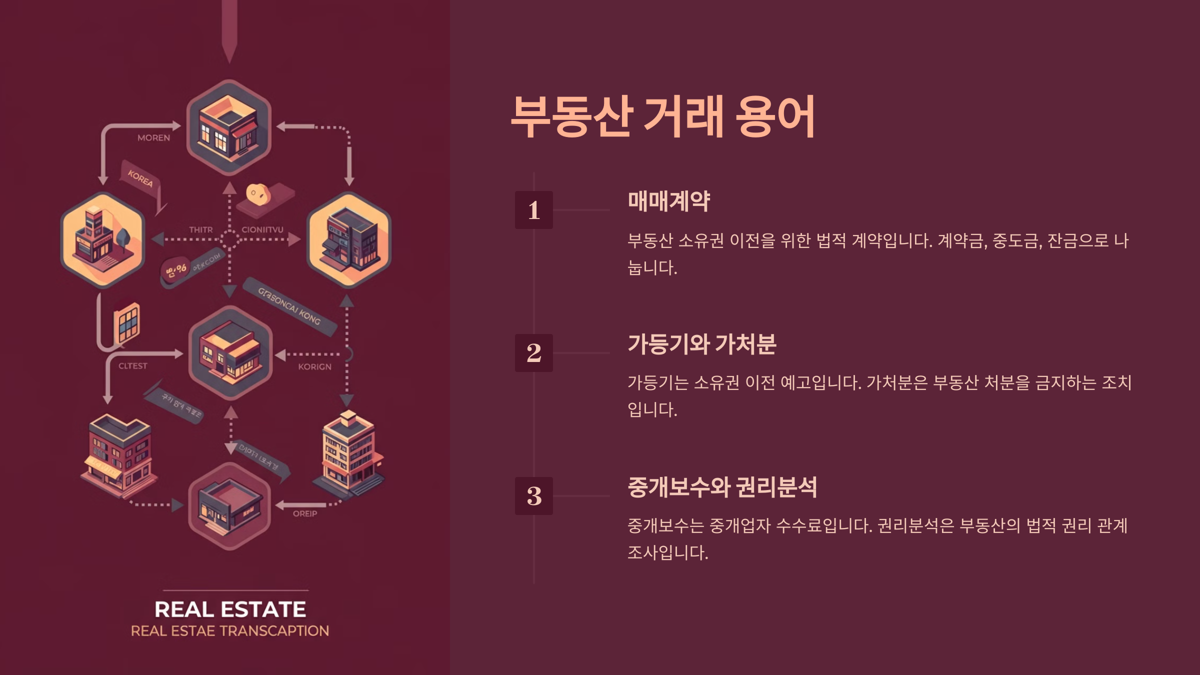 매매계약은 부동산 소유권 이전을 위한 법적 계약이며, 계약금(통상 10%), 중도금, 잔금으로 나누어 거래가 이루어집니다. 가등기는 소유권 이전을 예고하는 임시 등기이며, 가처분은 부동산 처분을 금지하는 법적 조치입니다. 이러한 거래 절차는 시장 참여자들의 역할을 이해하는데 중요합니다.