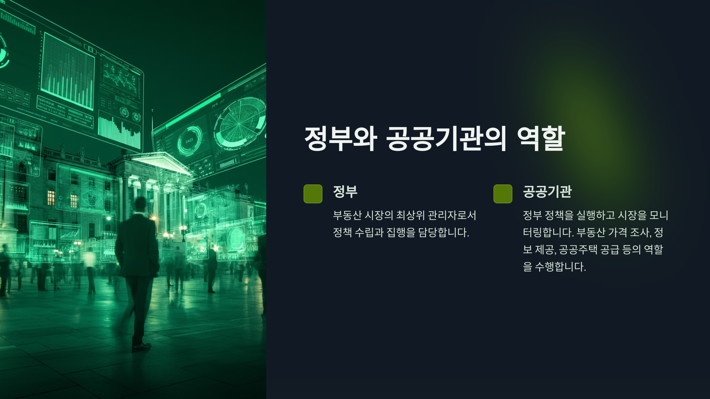 한국부동산원, LH공사 등 공공기관은 정부 정책을 실행하고 시장을 모니터링합니다. 이들은 부동산 가격 조사, 정보 제공, 공공주택 공급 등의 역할을 수행합니다. 최근에는 데이터 기반의 시장 분석도 주요 업무가 되었습니다.