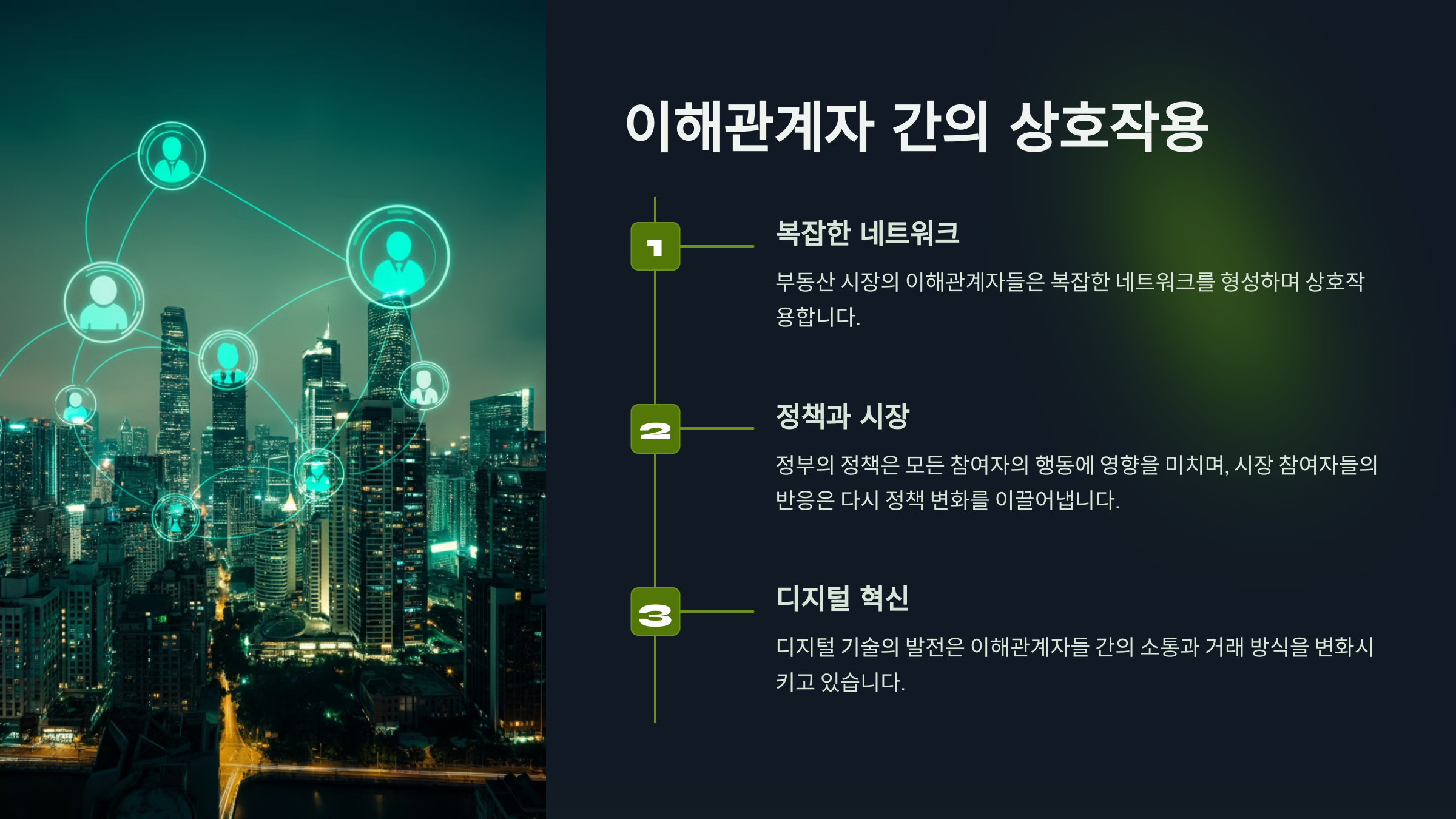 부동산 시장의 이해관계자들은 복잡한 네트워크를 형성하며 상호작용합니다. 정부의 정책은 모든 참여자의 행동에 영향을 미치며, 시장 참여자들의 반응은 다시 정책 변화를 이끌어냅니다. 디지털 기술의 발전은 이해관계자들 간의 소통과 거래 방식을 변화시키고 있습니다.