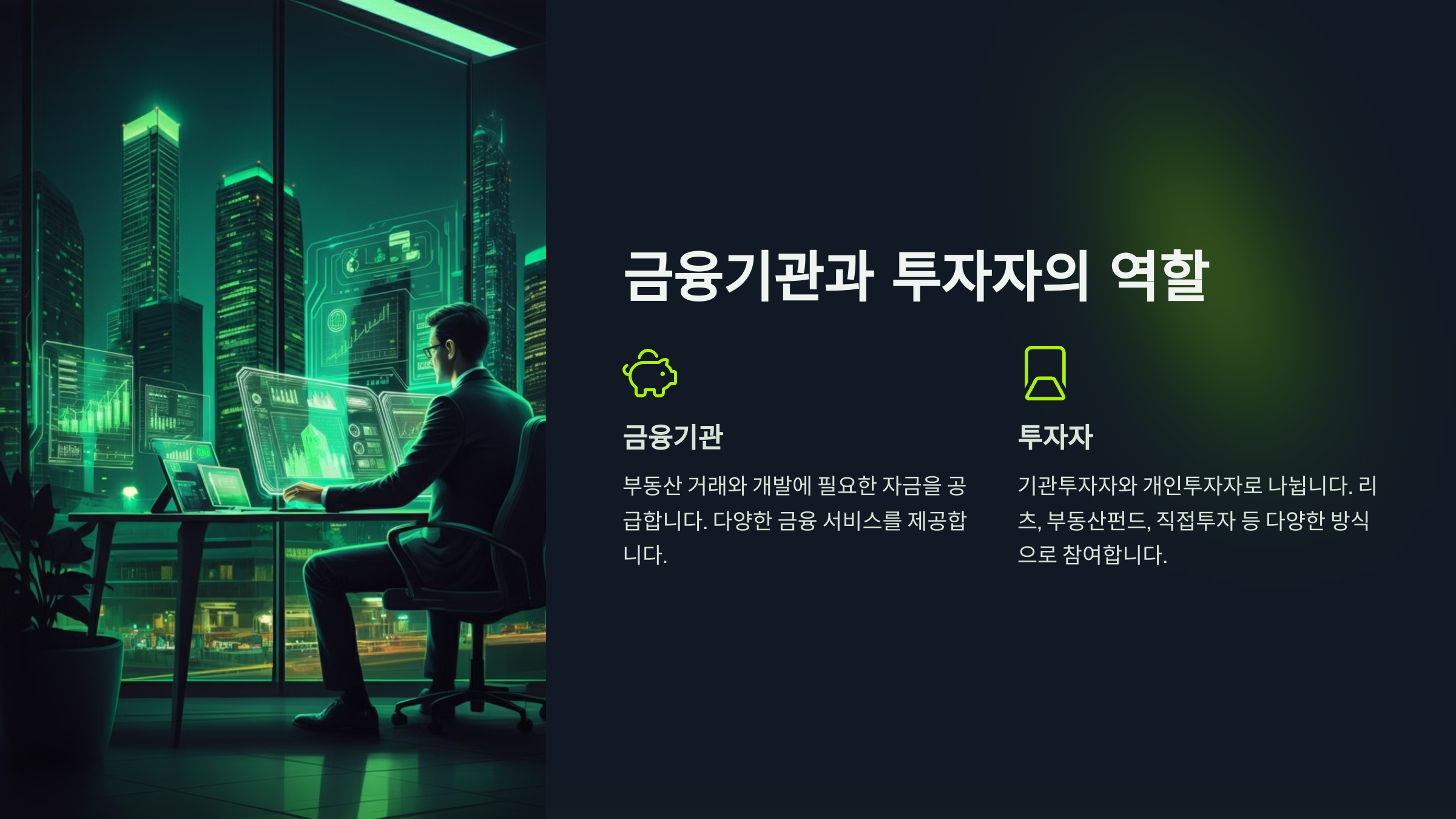 은행, 보험사 등 금융기관은 부동산 거래와 개발에 필요한 자금을 공급합니다. 주택담보대출, 프로젝트 파이낸싱(PF), 부동산신탁 등 다양한 금융 서비스를 제공합니다. 기관투자자들은 리츠(REITs), 부동산펀드 등을 통해 대규모 투자를 진행합니다. 거시경제적 요인에 따라 이들의 투자 전략이 달라집니다.